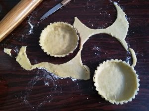 - Pour foncer (déposer la pâte dans le moule), déposez la pâte sur votre rouleau sans la casser sur le moule. Utilisez une main pour maintenir le bord et de l’autre, abaissez la pâte dans le fond du moule. Appuyez sans laisser de trace pour faire adhérer la pâte.