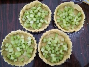 La pâte brisée est nettement meilleure lorsqu’on la fait soi-même - Égouttez les dés de rhubarbe et déposez-les sur vos fonds de pâte.