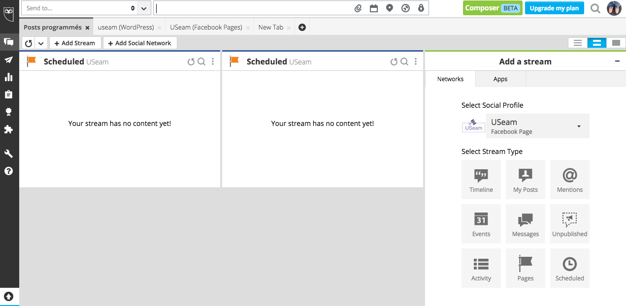 Un autre outil que j’utilise pour le community management est Hootsuite. Comme je n’obtenais pas ce que je voulais pour automatiser la publication des billets de mon blog WordPress sur mon page Facebook avec IFTTT, j’utilise Hootsuite. WordPress propose effectivement de programmer la publication des billets mais toutes les recettes que j’ai faites avec IFTTT ne donnaient pas le résultat que je voulais. En l’occurrence, il n’y avait pas une photo du billet or, un post Facebook sans photo, c’est un peu comme un cupcake sans glaçage… Hootsuite me permet donc de programmer des posts Facebook et Instagram pour annoncer la publication d’un nouveau billet sur mon blog, en ajoutant la photo que j’ai choisie de mettre en avant dans mon billet. J’écris les posts et c’est la publication que je programme, le jour et heure que je souhaite.