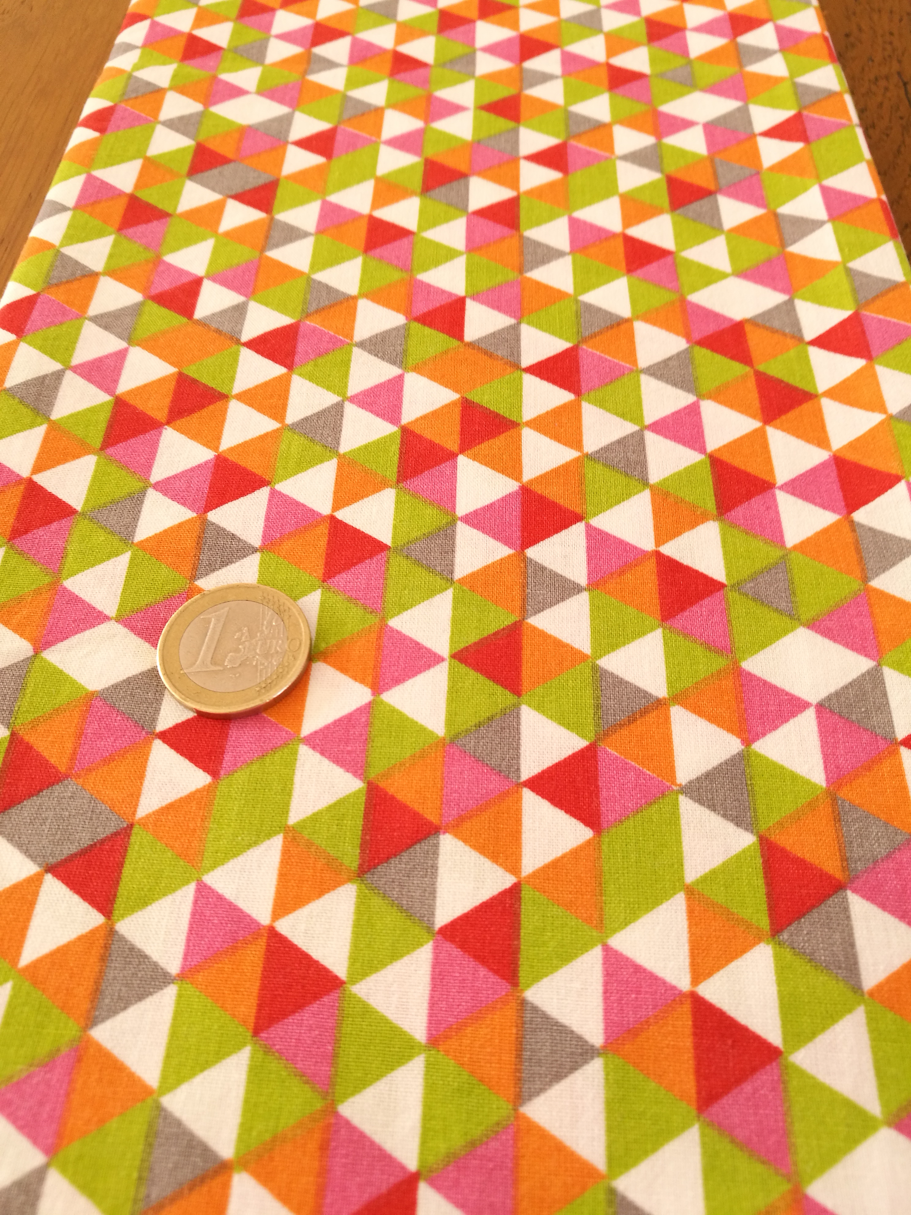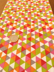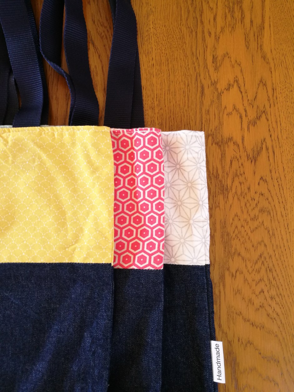 Ce qui les démarque du sac jaune lavasse et qui remplace l’impression textile, ce sont les deux tissus de matières différentes que j’utilise : un coton imprimé à motif de couleur vive et gaie et un denim bleu sombre.