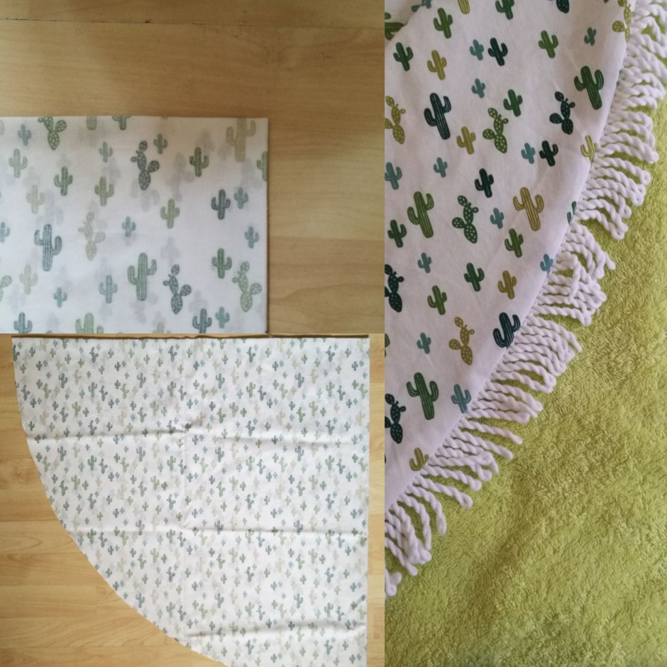 - Pour assembler les deux tissus et les franges, je vous conseille de procéder en deux fois. Posez et épinglez les franges sur l’endroit du coton (franges vers l’intérieur du cercle) puis cousez à 5 mm du bord. Pour déterminer la quantité, il vous suffira de calculer le périmètre de votre cercle : rayon x 2 x π ; j’ai choisi un rayon de 72 cm donc 72 x 2 x π = 452 cm ; j’ai donc demandé 5 m de franges à la mercerie. N’hésitez pas à prendre un peu plus.
