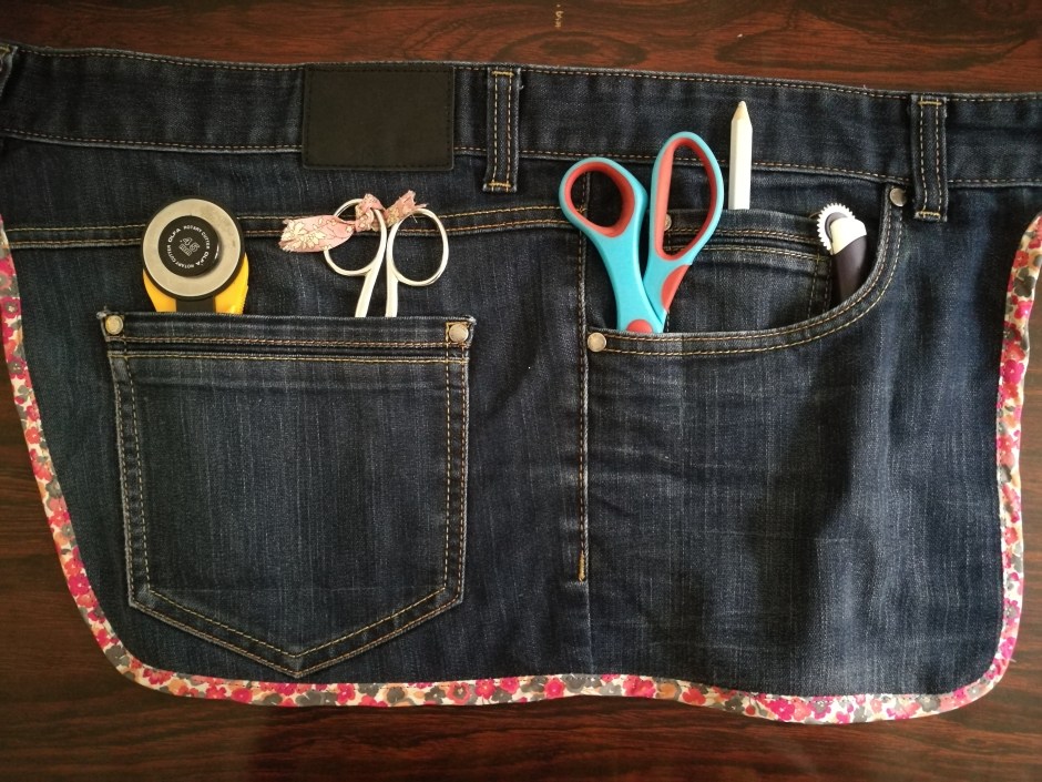 L’inspiration m’est venue évidemment des ceintures d’outillage et de jardinage. J’avais vu aussi que la gagnante de la saison 2 de Cousu Main sur M6, Nadia, avait une telle ceinture. Restait à trouver la base et une occasion a mis entre mes mains un vieux jean homme troué, ce qui permet d’être dans une démarche de récupération.