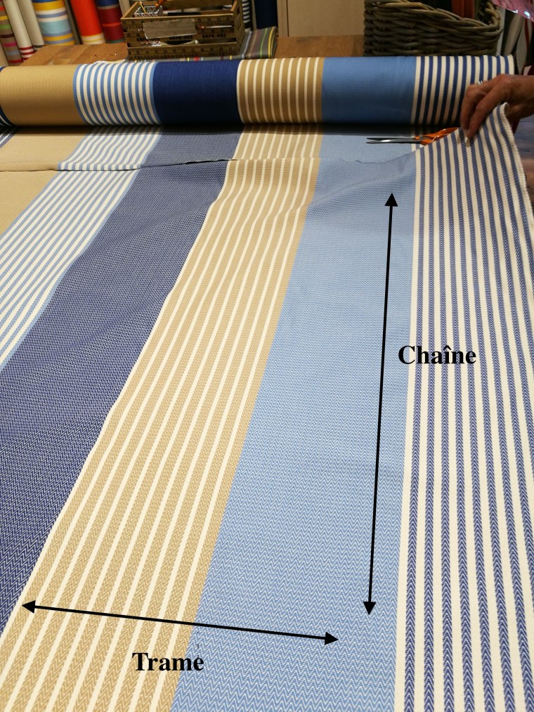 Les motifs de ce tissu (rayures) sont dans le sens de la chaîne.