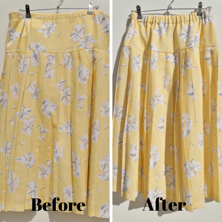 Une autre façon de redonner vie à un vêtement est de le transformer. C’est d’ailleurs ce que j’ai fait récemment en transformant un vieux jean homme en jupe en denim et en wax. Vous trouverez aussi dans la boutique deux produits faits à partir de vêtements vintage : une robe à petits carreaux des années 1970 et une jupe plissée jaune avec de grandes fleurs blanches.