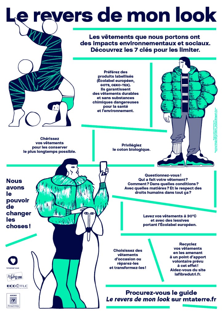 Pour en savoir plus, je vous conseille de lire ce document, très pédagogique, rédigé par l’ADEME, intitulé Le revers de mon look. Vous pouvez le télécharger en cliquant ici. Voici en tout cas une affiche qui résume le tout :