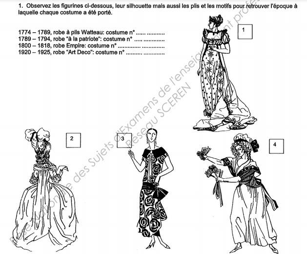 En lisant les annales de l’examen, on voit que les examinateurs demandent aux candidats de reconnaître à quelle époque appartient le costume. Il faut donc relier le nom du costume à l’image.
