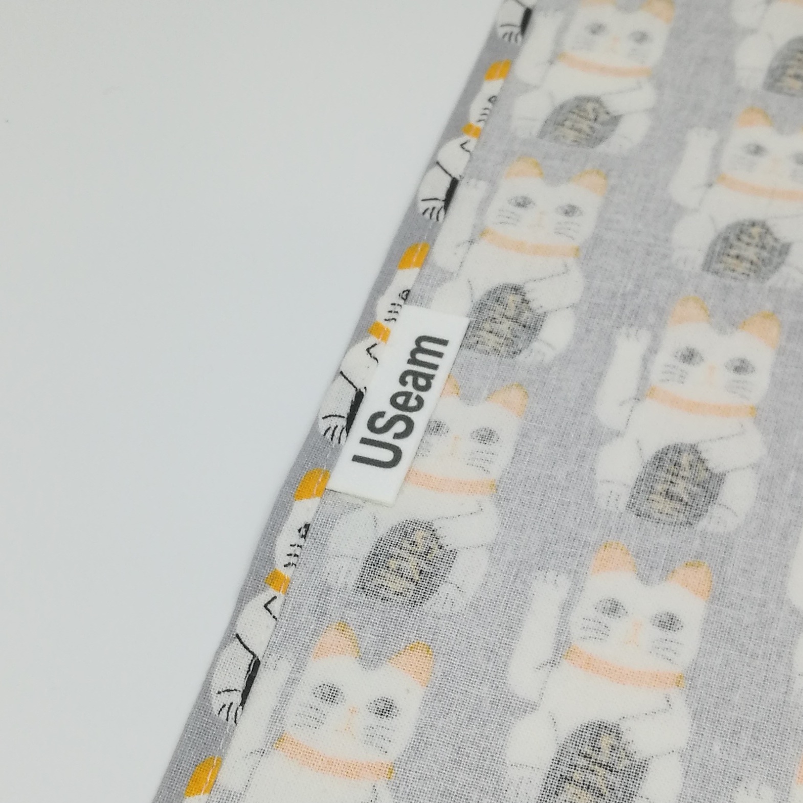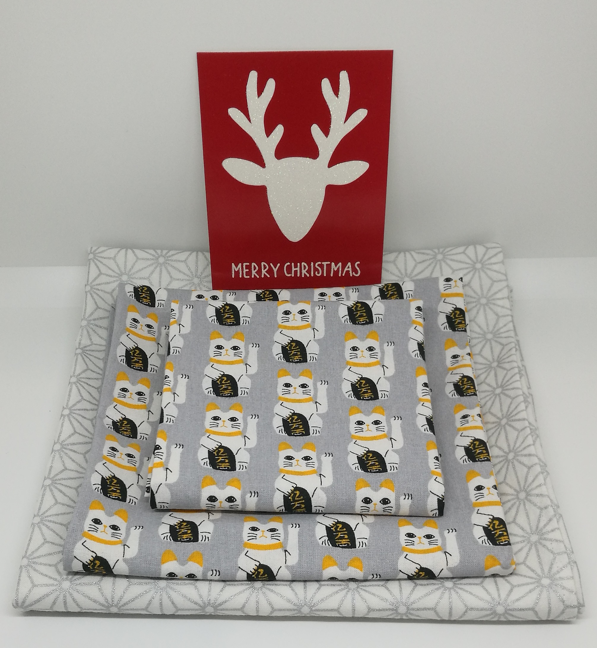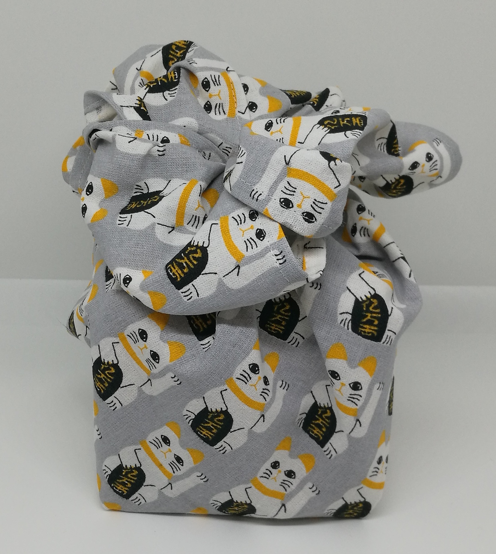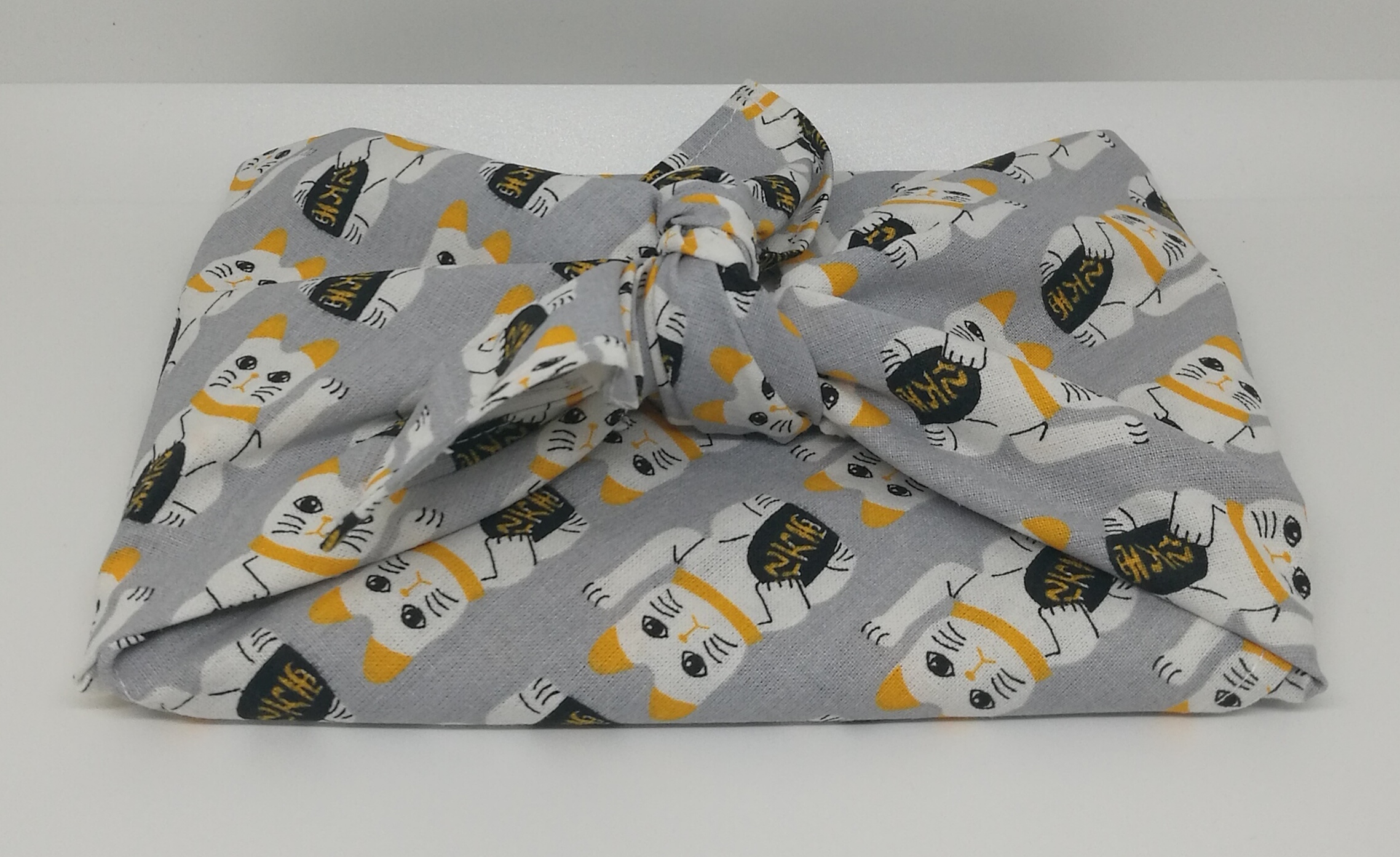 Ces furoshiki sont tous en tissus d’origine végétale, en coton et en lin ; les tissus sont unis ou à motifs. J’ai choisi des motifs rappelant les origines japonaises de cet objet : les asahona (étoiles) ou encore le maneki-neko, qui est une statuette traditionnelle japonaise représentant un chat assis et levant la patte au niveau de l’oreille. Cette statuette, mise à la devanture des magasins, est sensée attirer la fortune. Ce chat est aussi appelé « chat porte-bonheur ».