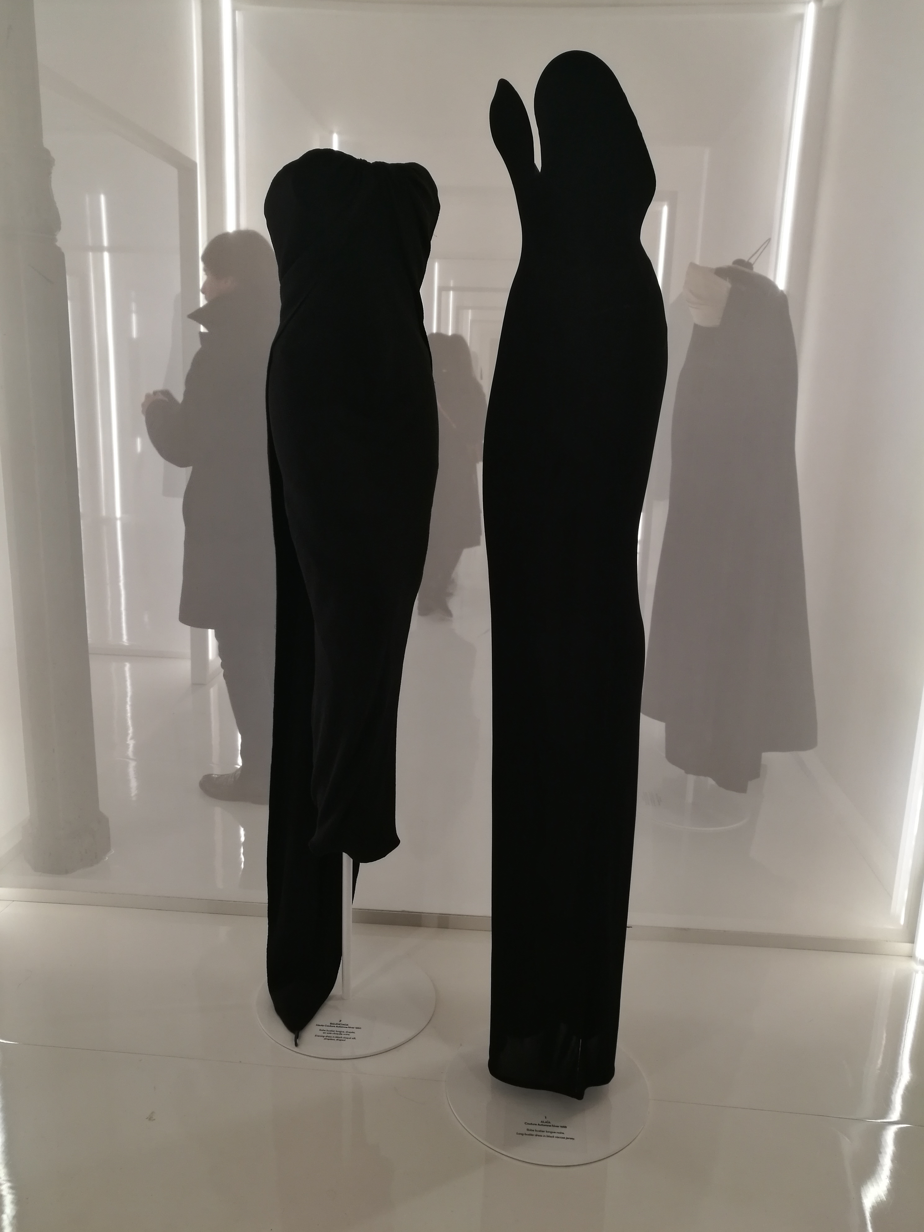 Les deux couturiers présentent, en effet, de nombreuses similitudes comme le travail du noir, des noirs profonds – une exposition « Balenciaga, l’œuvre au noir » avait d’ailleurs eu lieu en 2017. Ils sont tous deux vus comme des sculpteurs, des architectes de la forme et des volumes. Les pièces de Balenciaga, plus anciennes parfois de quelques décennies, restent intemporelles, et peuvent ainsi être présentées à côté des pièces d’Alaïa. Il est même parfois difficile de les distinguer. On a parfois l’impression qu’elles ont été faites pour la même collection.