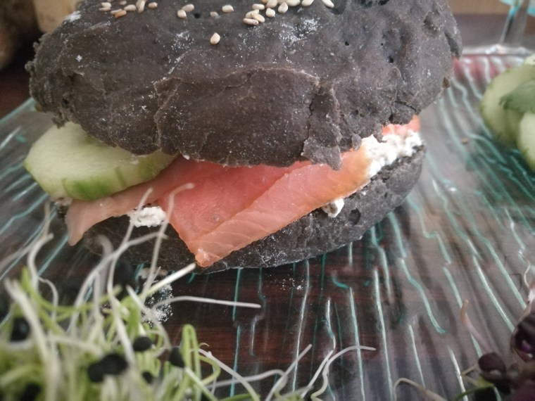 Pour réaliser les buns, la recette reste la même à ceci près qu’il faut remplacer 100 g de farine de blé de froment par de la farine de seigle (qui donnera un goût profond à votre bun) et qu’il faut ajouter de l’encre de seiche. J’ai acheté un sachet de 4 g, ce qui a suffi amplement. Par contre, je n’ai pas fait dorer le bun avec un jaune d’œuf. Vous pouvez remplacer les graines de sésame par des graines de sésame noir.