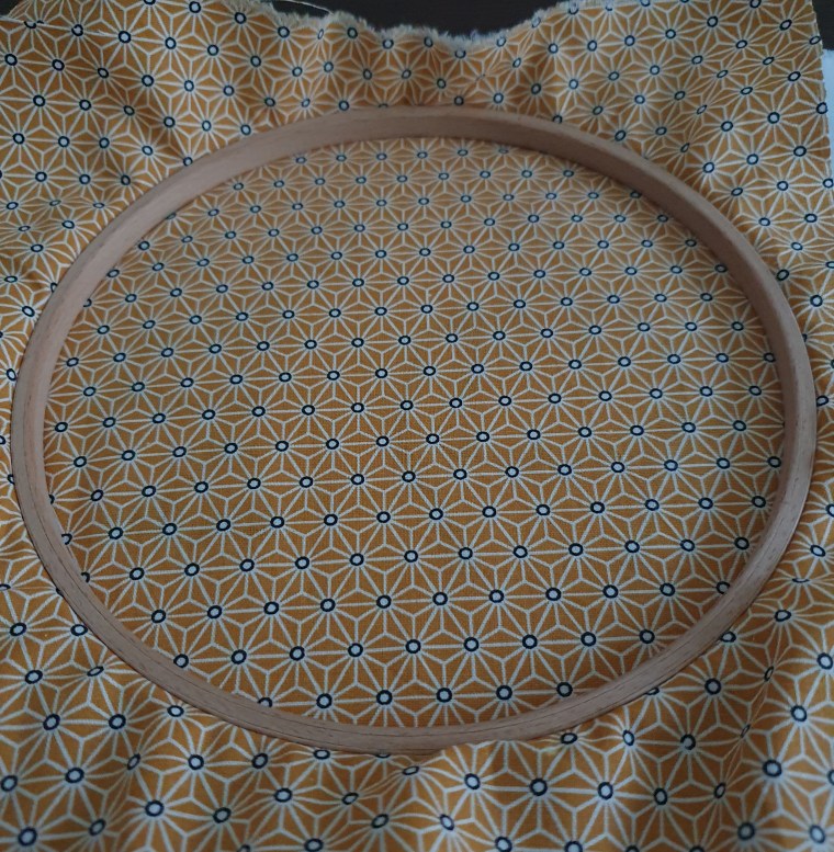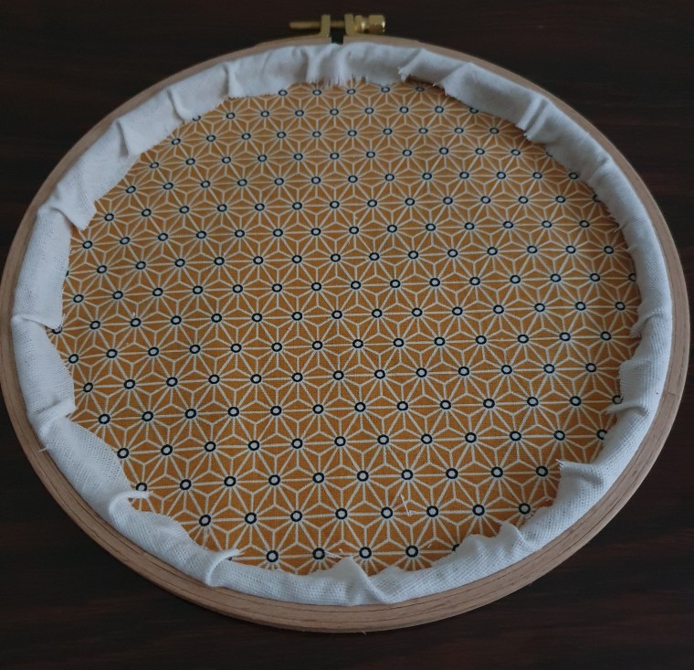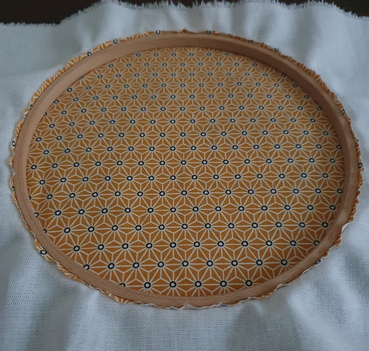Vous pouvez télécharger le modèle en cliquant ici. Pour le recopier, rien de plus simple. Posez le modèle et votre tissu sur la vitre d’une fenêtre. Par transparence, recopiez les contours. Les points de broderie utilisés sont le point arrière et le point lancé pour réaliser le vernis à ongle. Pour finir, j’ai utilisé le tambour de 19 cm de diamètre comme cadre. Afin de cacher les points, recouvrez d’un tissu. Enserrez votre broderie dans le tambour. Découpez le surplus du tissu le long du tambour. Découpez le tissu brodé en laissant une marge puis, à l’aide d’un pistolet à colle, collez cet excédent sur le tambour. Cela permet de finir proprement votre broderie.