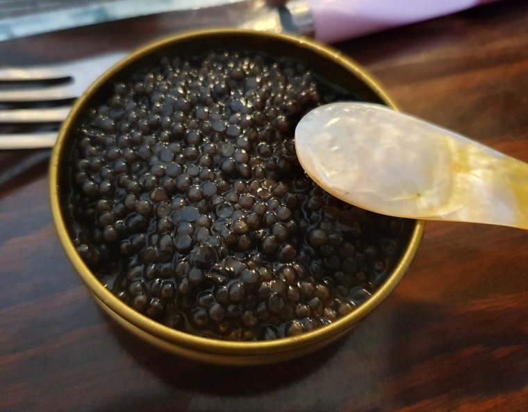 - Pour la garniture, mélangez la crème et le mascarpone. Ajoutez le citron. Déposez sur le blini ce mélange puis au centre, une petite cuillerée de caviar. Par contre, il est impératif de servir le caviar à l’aide d’une cuillère en nacre, en bois ou en corne. Il faut éviter l’inox ou l’argent qui neutralisent le goût du caviar.