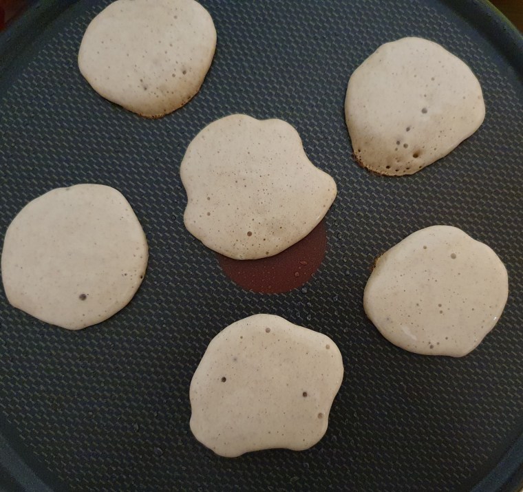 - Vous pouvez faire cuire les blinis à la poêle ou bien, comme je l’ai fait, sur la plaque supérieure d’un appareil à raclette. Prévoyez un tampon avec une huile neutre, de type huile de tournesol. Pour faire cuire les blinis, déposez une cuillerée à soupe de pâte, laissez cuire 2 à 3 minutes, retournez et laissez cuire encore 1 minute.