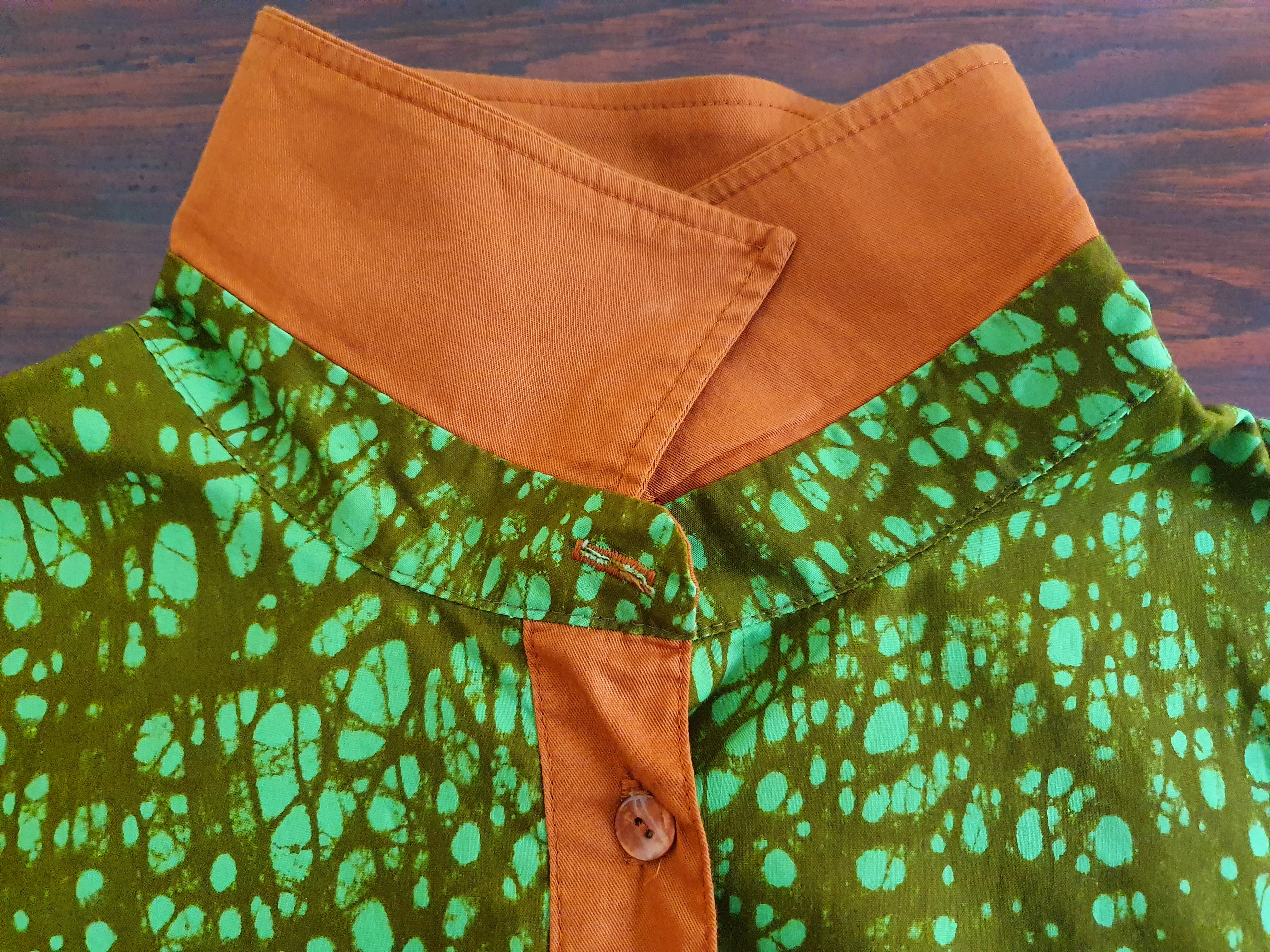 La patte de boutonnage du devant gauche est normalement à même, c’est-à-dire qu’elle est comprise dans la pièce du devant. Vous avez juste à la plier et à faire une couture pour la former. Comme je voulais que cette pièce soit en wax, j’ai dû donc couper 3,2 cm du devant gauche pour coudre la patte de boutonnage en wax (largeur : 5,2 cm marges comprises). Si vous voulez faire comme moi, je vous conseille de couper, dans un premier temps, le devant gauche selon le patron puis de couper ensuite la patte de boutonnage. Il vous suffira de couper au dernier moment le surplus. Comme cela, aucune chance de vous tromper !