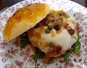 - Procédez au montage : coupez en deux le pain. Sur la partie inférieure, déposez un peu de sauce pour les pâtes. J’ai utilisé de la sauce aux poivrons et à l’aubergine. Déposez ensuite la roquette, l’escalope, la pancetta, la compotée d’oignon, les câpres et recouvrez du chapeau du pain à burger. Maintenez avec une pique en bois et passez au four pendant 5 minutes ;