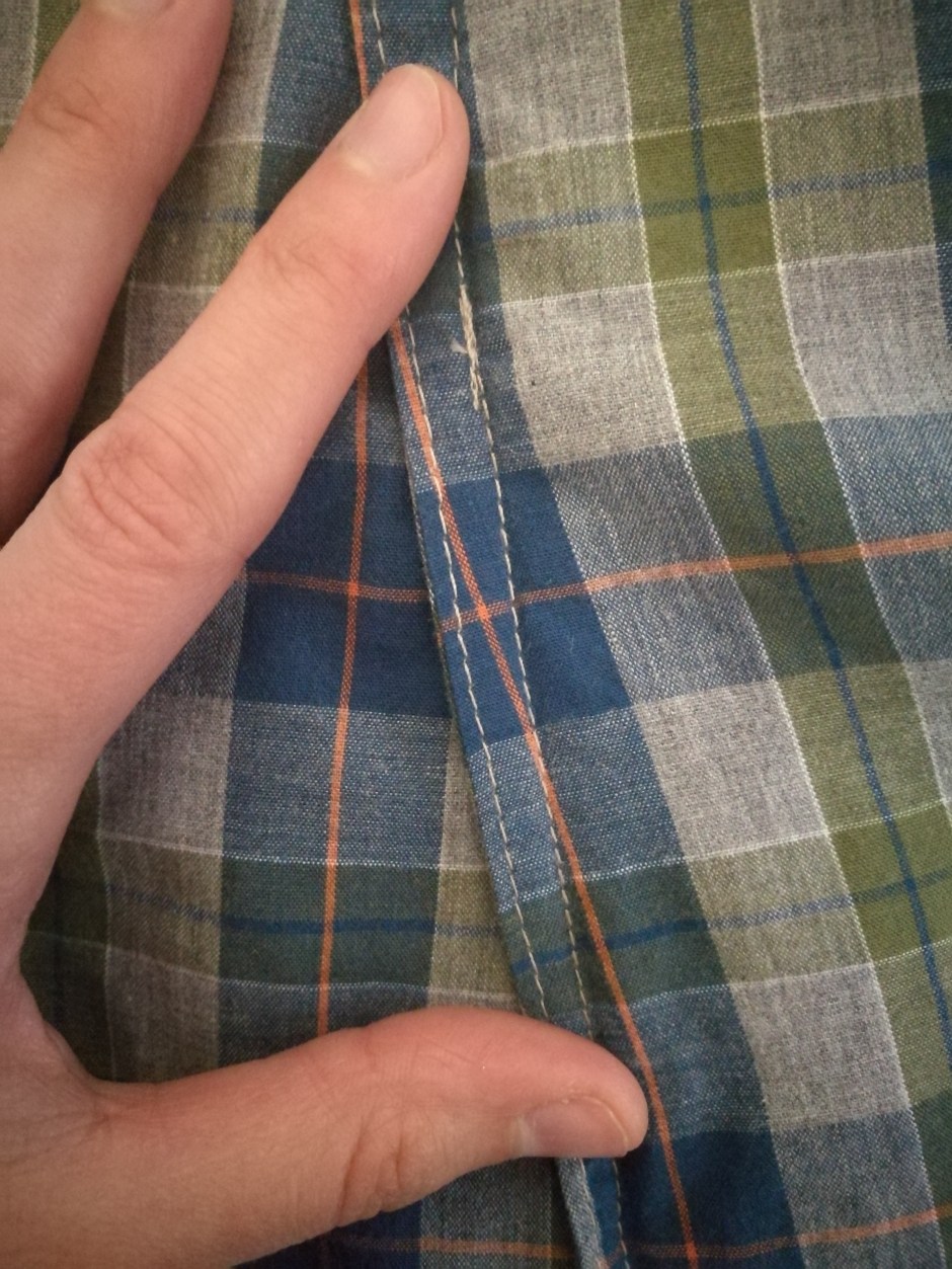 Cette couture peut se faire sur des coutures courbes (comme les têtes de manche). Elle est simple à réaliser : l’une des marges est pliée par-dessus l’autre et cousue ainsi, comme vous le ferez pour un ourlet.
