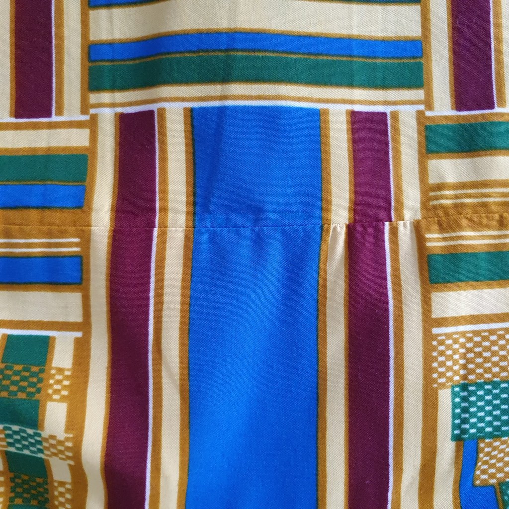 Raccorder la poche avec le devant gauche et l’empiècement dos (intérieur et extérieur) a plutôt été facile. Même si la poche présente un léger décalage, cela est dû malheureusement au motif qui n’est pas imprimé de manière géométrique et droite. Il est lui même décalé donc si vous cousez du wax ou du kente, ne vous mettez pas martel en tête avec cela.