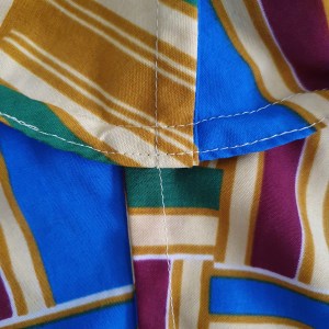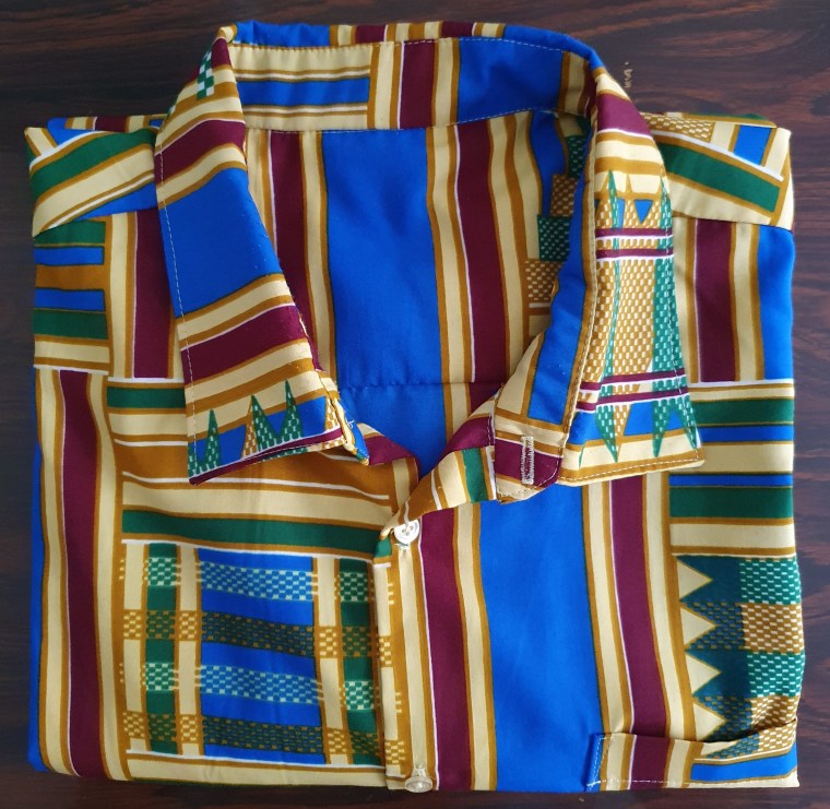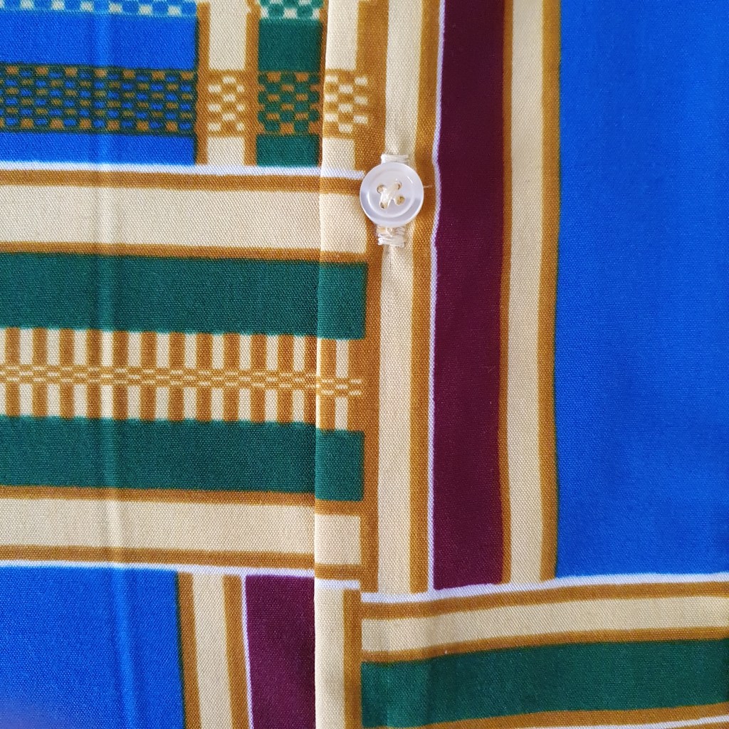 J’ai fabriqué cette chemise dans un très beau tissu, très coloré, comme vous pouvez le voir. Il s’agit d’un kente, acheté chez Holland Textiles. Traditionnellement, le kente est un tissu africain tissé en bandelettes cousues ensuite entre elles pour former un pagne. Pour le tissu que j’ai acheté, la technique utilisée est la même que celle utilisée pour fabriquer du wax. Par contre, les motifs sont ceux d’un kente : géométriques et colorés. Si vous voulez en savoir plus, je vous invite à cliquer ici pour lire mon billet sur les tissus africains.