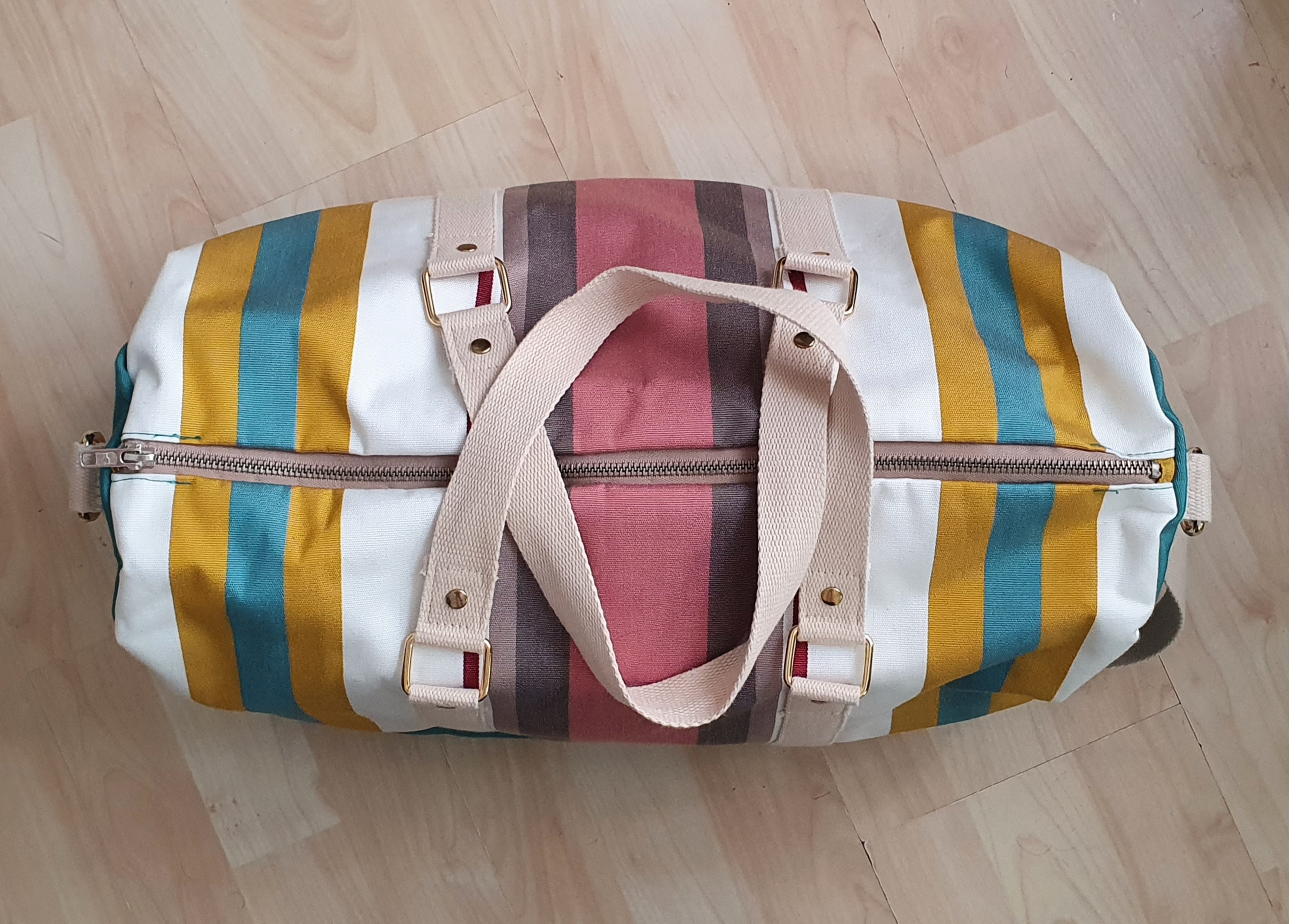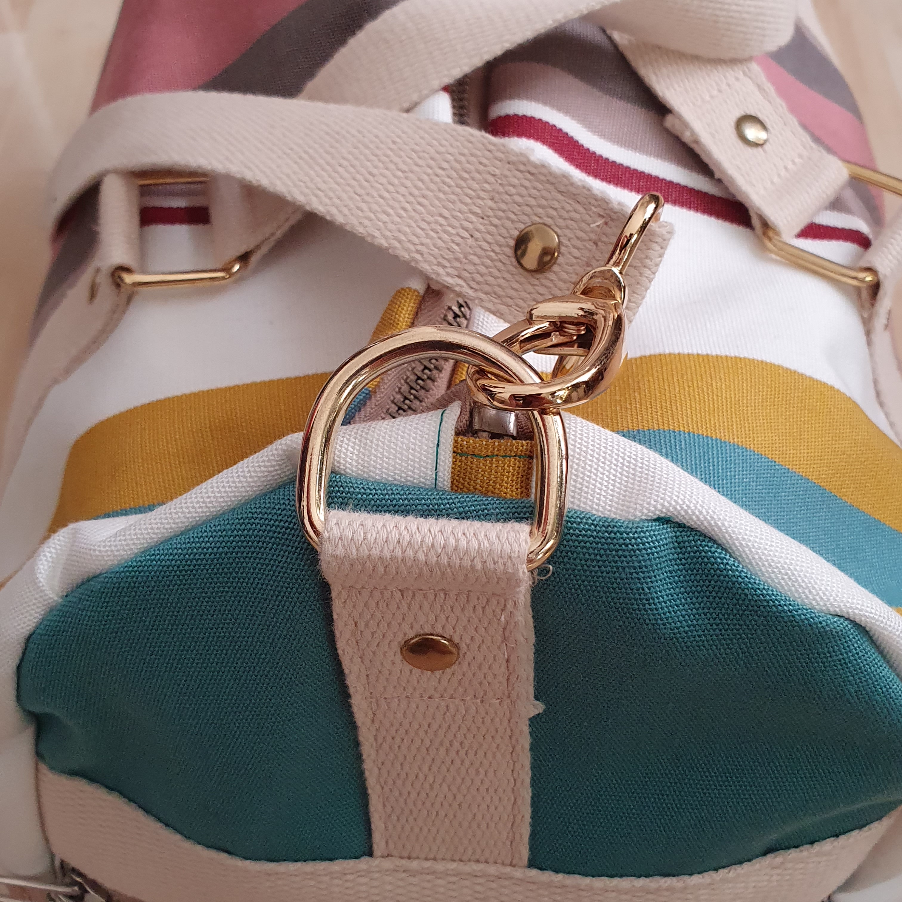 Pour les autres fournitures, La Mercerie des Créateurs (mercerie en ligne) propose des kits spéciaux pour réaliser le sac comprenant les boucles, les étriers et les mousquetons. J’ai choisi du doré car l’argent ne me va pas au teint. Pour les sangles et les fermetures éclair, j’ai opté pour du beige, une couleur neutre qui s’accorde avec toutes les couleurs de mon tissu à rayures. Comme d’habitude, j’ai adapté le patron à ce que je voulais faire et obtenir.
