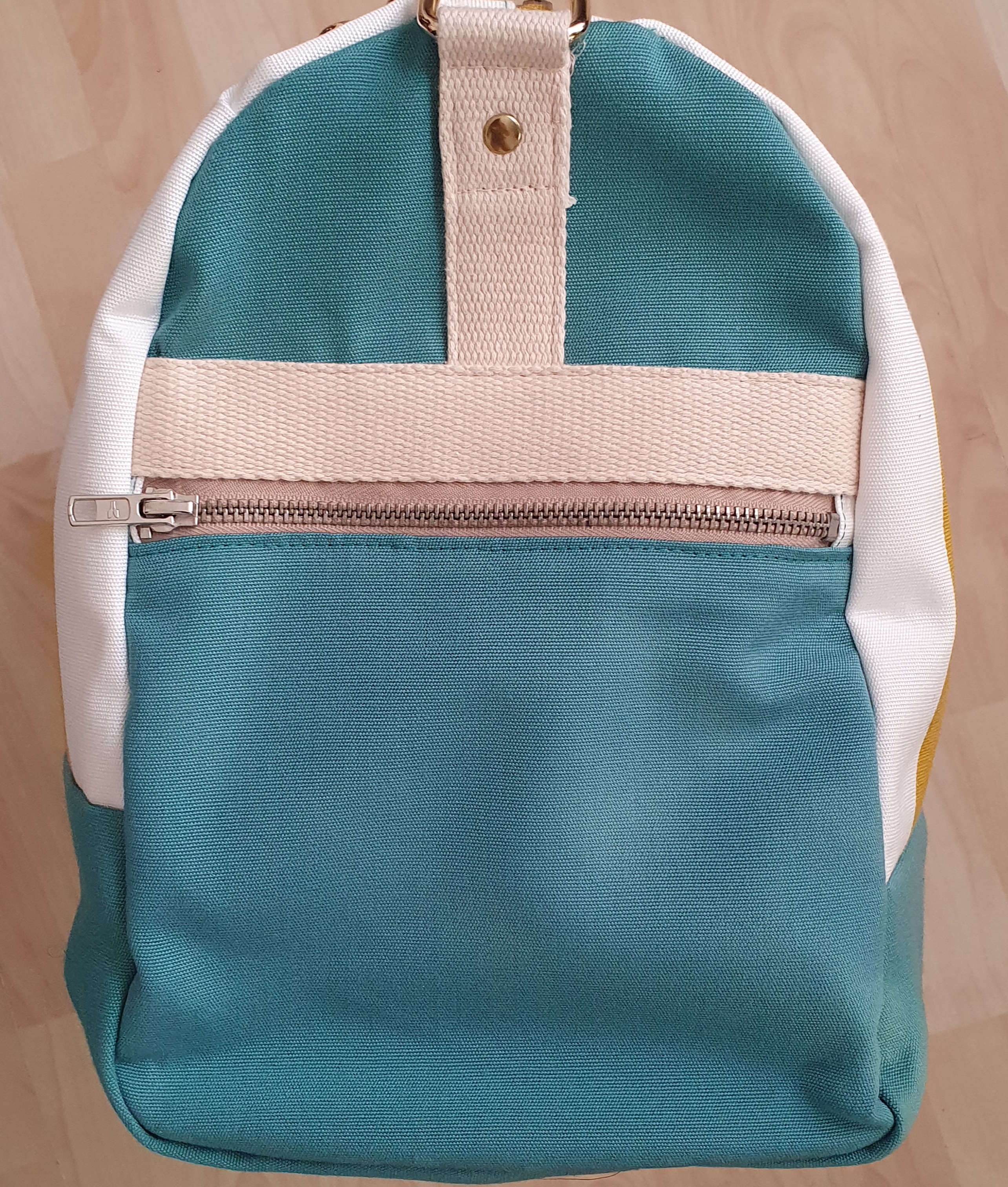 Je suis très contente de ce sac car il me ressemble. J’ai choisi des couleurs et des motifs que j’aime : beige, bleu canard, sans oublier les rayures ! Je le trouve vraiment commode pour partir en week-end. Sa taille est idéale et les trois poches sont très pratiques. Je recommande vivement cette marque de patrons d’accessoires !