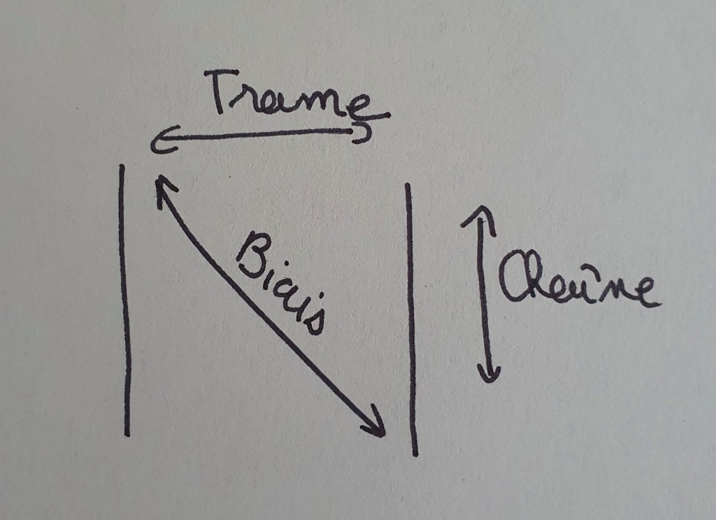 La trame est perpendiculaire à la lisière. Le biais, c’est la diagonale du tissu. Il est particulièrement élastique. Comme un dessin vaut mieux que des explications, voilà !