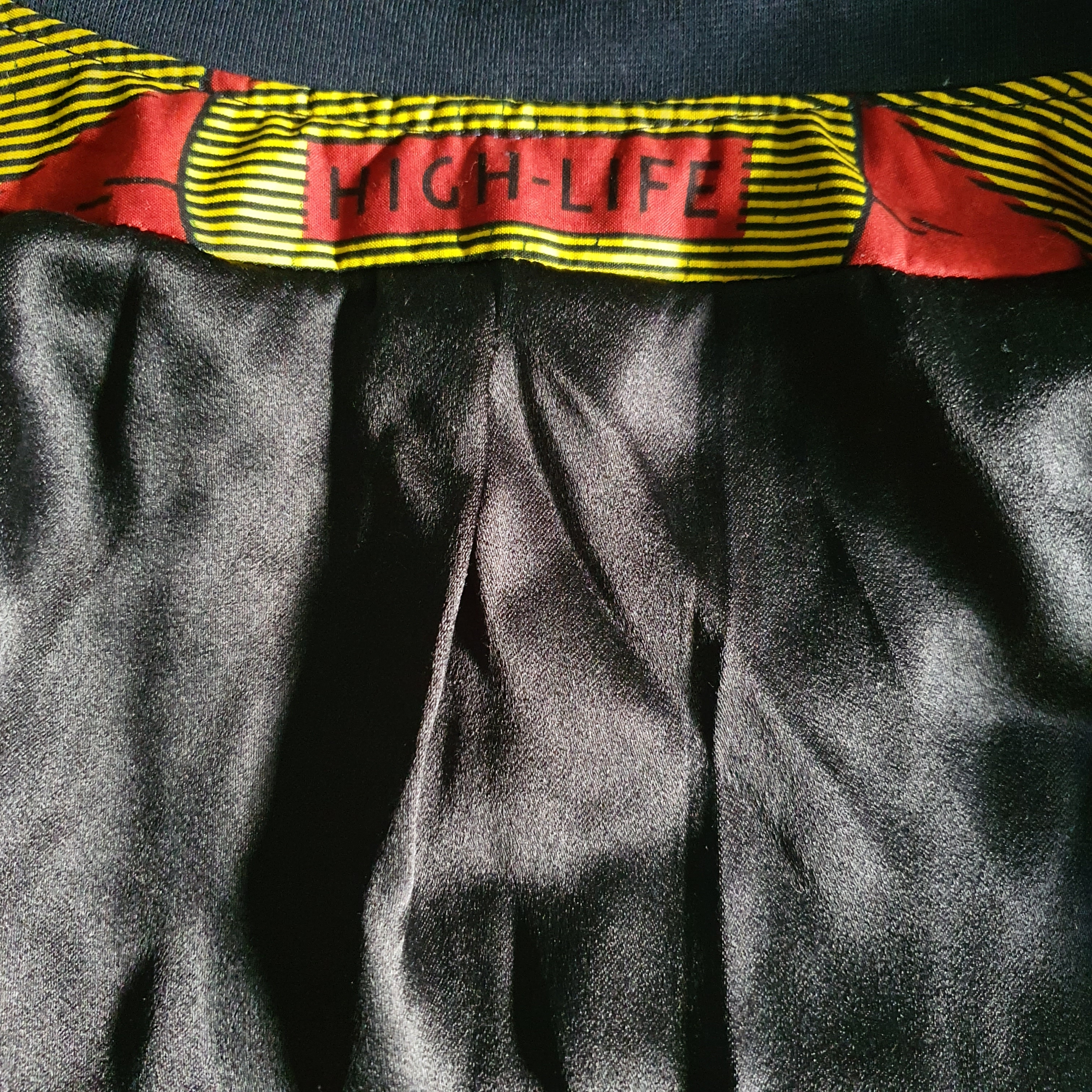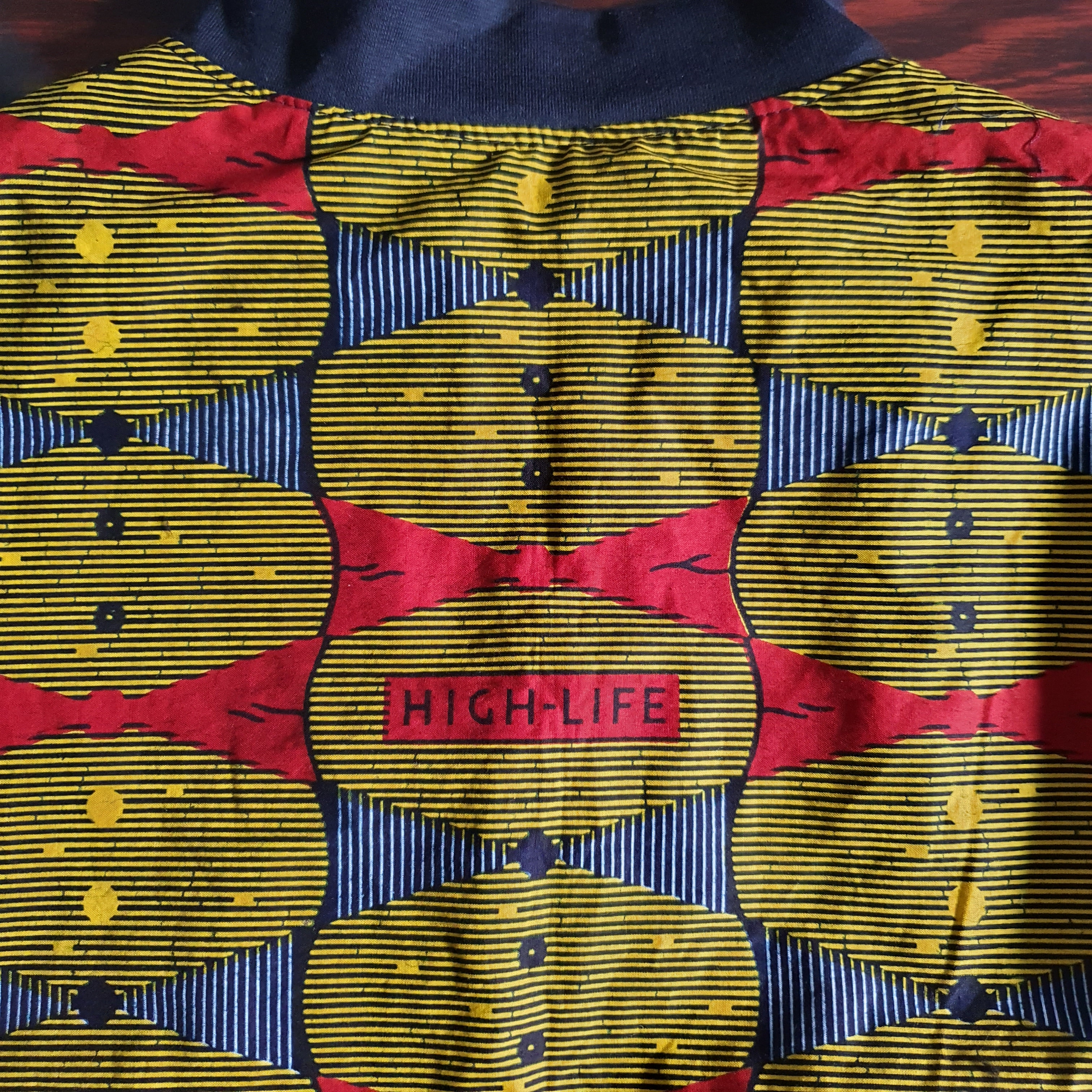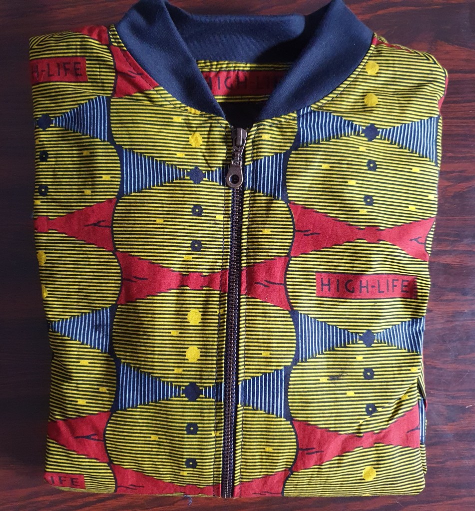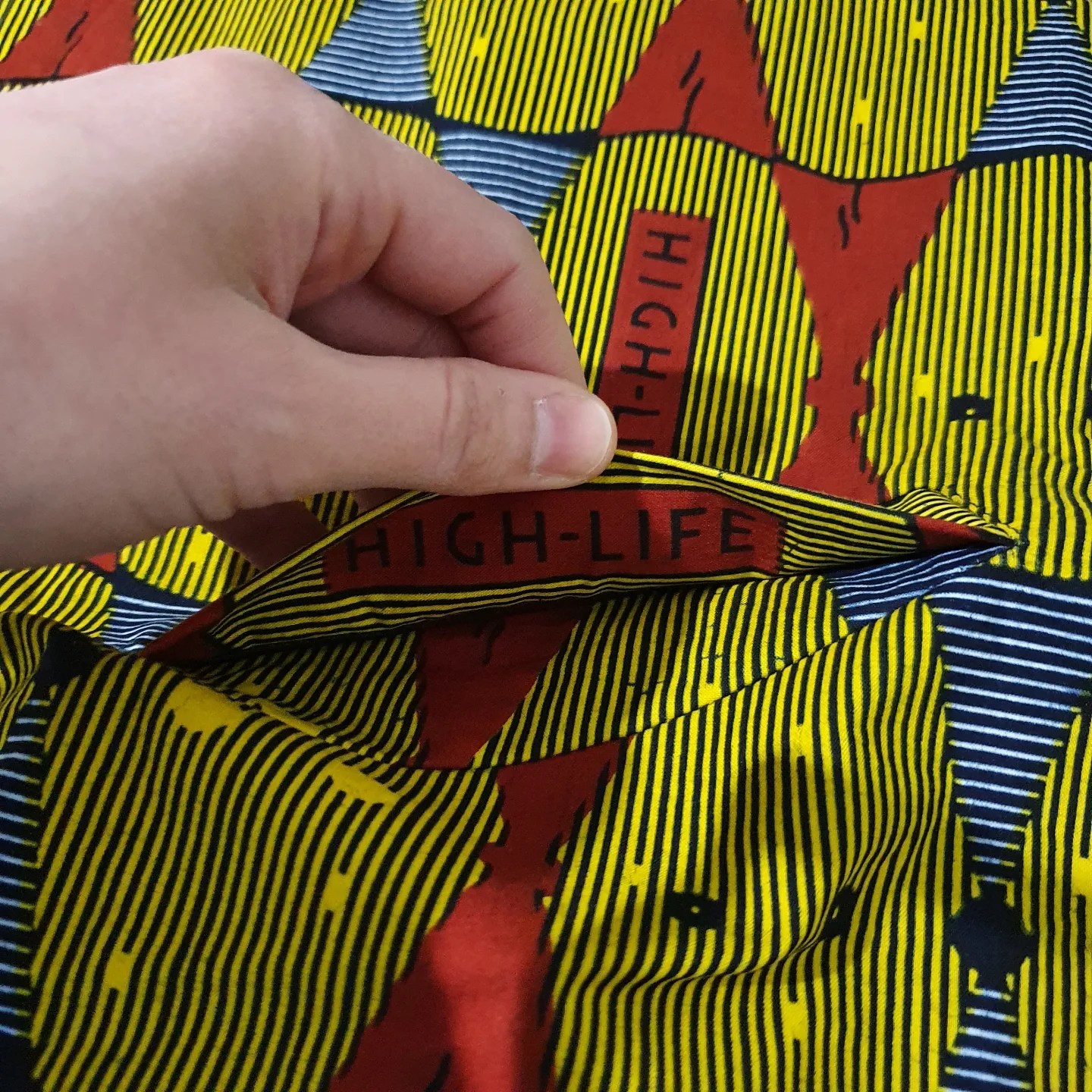 Au contraire, pour le teddy L’Irrésistible de BG que j’ai réalisé en wax, j’ai choisi de mettre un élément du motif à des éléments stratégiques. Il y avait sur le motif un cartouche avec l’inscription « High-Life ». Avant de couper le tissu, j’ai déterminé les endroits où je voulais voir apparaître ce cartouche :