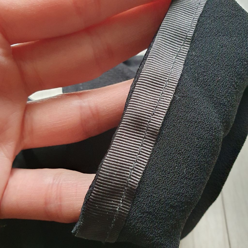 J’ai fait des coutures anglaises pour toutes les coutures, sauf pour les emmanchures, les manches et les ourlets. J’ai cousu un biais sur les emmanchures et la couture des manches comportant la partie en dentelle et les deux volants. Vous pouvez faire le biais dans le même tissu que celui de votre vêtement. Pour ma part, j’ai aussi utilisé une chute de biais en coton noir. Pour les ourlets, j’ai choisi une autre méthode : celle du ruban. Pourquoi ce choix ? Les coutures anglaises créant une surépaisseur, il aurait été difficile de coudre l’ourlet à cet endroit. En cousant un ruban, large de 1,5 cm environ, j’ai pu éviter ce problème. Il vous suffit de coudre le ruban sur l’endroit puis de retourner sur l’envers et de le fixer avec une piqûre sur l’endroit. J’ai fait cela pour l’ourlet du bas de la robe et pour ceux des volants sur lesquels j’ai cousu le ruban, avant de monter les volants à la manche. Pour en savoir plus, sur les coutures fermées, je vous invite à lire mon billet en cliquant ici.