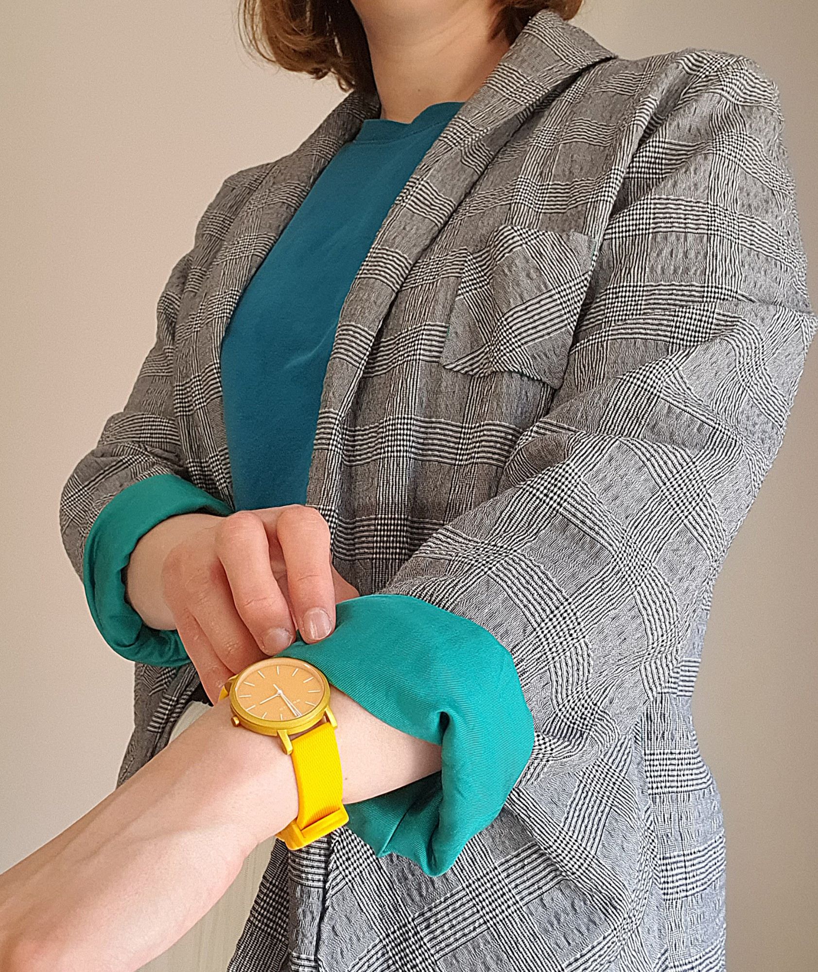 Cette veste peut se porter avec un pantalon habillé ou un jean. J’aime bien la mettre avec une jupe plissée qui est asymétrique et qui possède deux épaisseurs. C’est un look inspiré de la mode coréenne où l’on retrouve souvent un mélange de textures et aussi de l’asymétrie. J’aime bien porter avec cette veste ma montre jaune, de la marque Bering, pour mettre une touche de couleur à mon look.