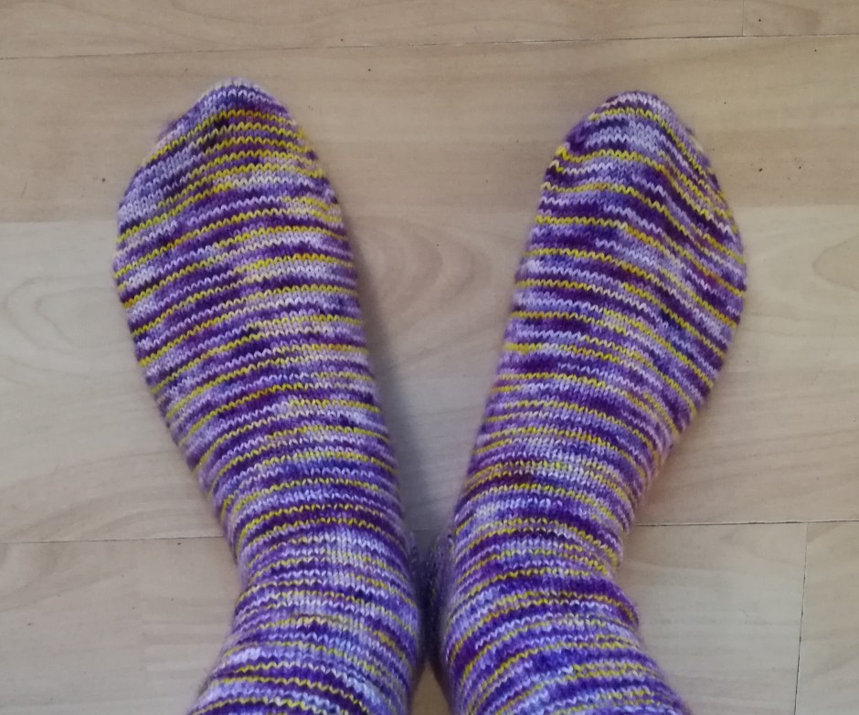 J’ai choisi pour réaliser cette paire la laine laine Viola des Fibres Fantastiques, une entreprise locale de laines teintes à la main. Cette merveilleuse laine est aux couleurs de la pensée. Je l’ai achetée dans la très jolie boutique Cœur de Mailles à Québec. Cette laine est un mélange de mérinos et de nylon, donc idéal pour les chaussettes. Il vaut mieux, en effet, éviter des fils 100 % laine au risque de feutrer vos chaussettes et donc qu’elles se trouent. Le résultat est très agréable, mes chaussettes sont d’une douceur incroyable !
