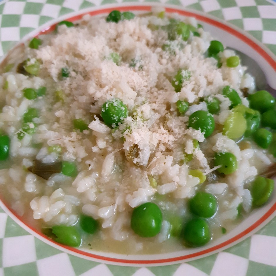 Le printemps est là ! De nouveaux légumes arrivent dans nos assiettes. C’est le moment de manger autre chose que des pommes de terre et des courges. Aujourd’hui, je vous propose un risotto de printemps avec des petits pois et des fèves, le tout frais bien sûr ! Il faudrait passer un peu de temps à les écosser mais cela vaut le coup ! On ralentit un peu, on cuisine en famille et on se fait plaisir. Ce plat a été celui de mon week-end pascal, en l’occurrence.